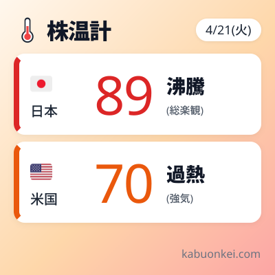 ブログや note、個人サイトに「株温計」の今日の市場温度を 1 行で貼り付けられる無料ウィジェットです。貼るだけで毎日自動更新されます。